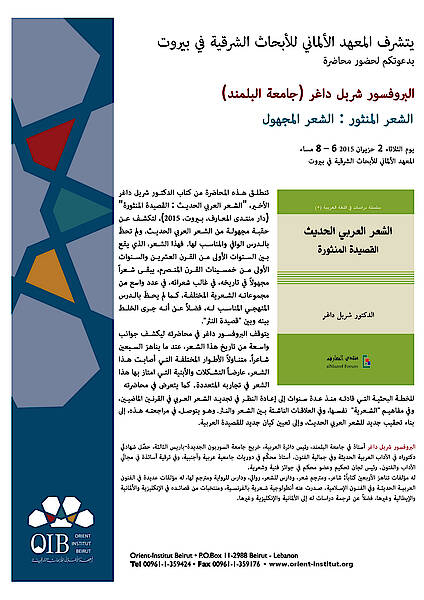 تنطلق هذه المحاضرة من كتاب الدكتور شربل داغر الأخير، "الشعر العربي الحديث: القصيدة المنثورة" (دار منتدى المعارف، بيروت، 2015)، لتكشف عن حقبة مجهولة من الشعر العربي الحديث، ولم تحظَ بالدرس الوافي والمناسب لها. فهذا الشعر، الذي يقع بين السنوات الأولى من القرن العشرين والسنوات الأولى من خمسينات القرن المنصرم، يبقى شعراً مجهولاً في تاريخه، في غالب شعرائه، في عدد واسع من مجموعاته الشعرية المختلفة، كما لم يحظَ بالدرس المنهجي المناسب له، فضلاً عن أنه جرى الخلط بينه وبين "قصيدة النثر"
