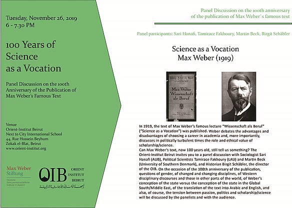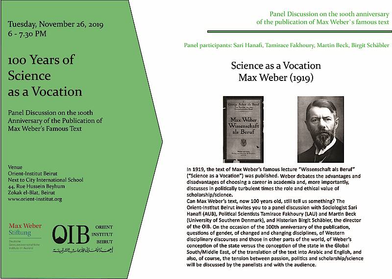 Can Max Weber’s text, now 100 years old, still tell us something? The Orient-Institut Beirut invites you to a panel discussion with Sociologist Sari Hanafi (AUB), Political Scientists Tamirace Fakhoury (LAU) and Martin Beck (University of Southern Denmark), and Historian Birgit Schäbler, the director of the OIB. On the occasion of the 100th anniversary of the publication, questions of gender, of changed and changing disciplines, of Western disciplinary discourses and those in other parts of the world, of Weber’s conception of the state versus the conception of the state in the Global South/Middle East, of the translation of the text into Arabic and English, and also, of course, the tension between passion, politics and scholarship/science will be discussed by the panelists and with the audience.