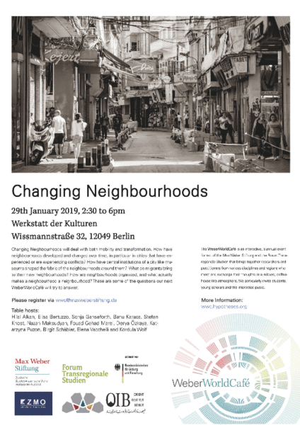The event “Changing Neighbourhoods” will take place on January 29, 2019 from 2:30 to 6:00pm in the Werkstatt der Kulturen, Berlin. The event is a cooperation between the Max Weber Stiftung – Deutsche Geisteswissenschaftliche Institute im Ausland, the Forum Transregionale Studien,the Orient Institut Beirut and the Zentrum Moderner Orient. It is curated by Hilal Alkan (Zentrum Moderner Orient), Nazan Maksudyan (Centre Marc Bloch), Nadia von Maltzahn and Birgit Schäbler (both Orient Institut Beirut).