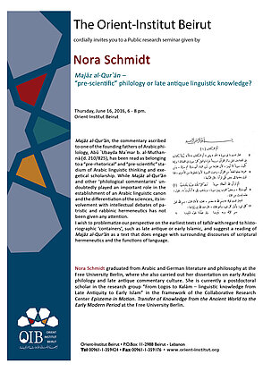 Nora Schmidt graduated from Arabic and German literature and philosophy at the Free University Berlin, where she also carried out her dissertation on early Arabic philology and late antique commentary culture. She is currently a postdoctoral scholar in the research group “From Logos to Kalām – linguistic knowledge from Late Antiquity to Early Islam” in the framework of the Collaborative Research Center Episteme in Motion. Transfer of Knowledge from the Ancient World to the Early Modern Period at the Free University Berlin.