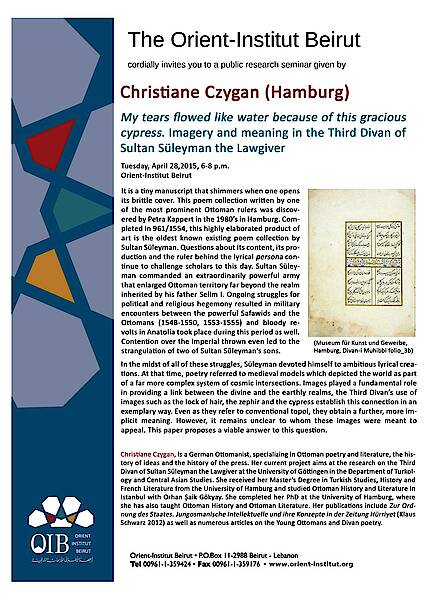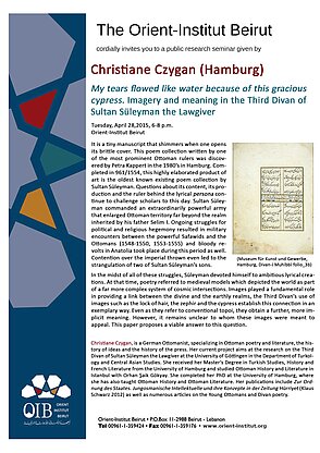 In the midst of all of these struggles, Süleyman devoted himself to ambitious lyrical creations. At that time, poetry referred to medieval models which depicted the world as part of a far more complex system of cosmic intersections. Images played a fundamental role in providing a link between the divine and the earthly realms, the Third Divan’s use of images such as the lock of hair, the zephir and the cypress establish this connection in an exemplary way. Even as they refer to conventional topoi, they obtain a further, more implicit meaning. However, it remains unclear to whom these images were meant to appeal. This paper proposes a viable answer to this question.