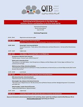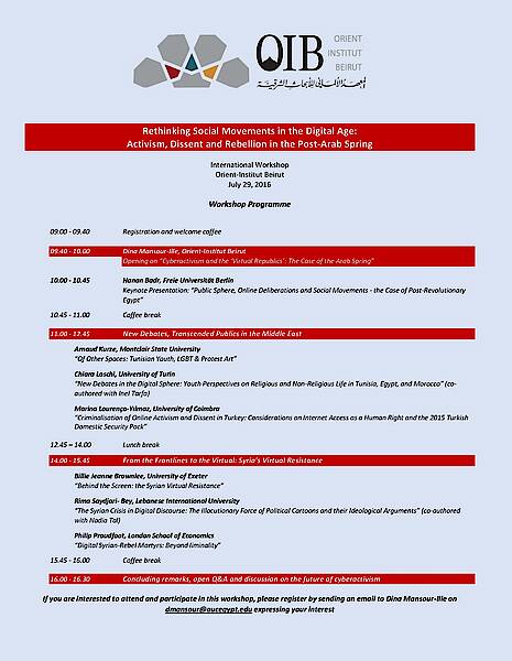 09.40 - 10.00 | Dina Mansour-Ille, Orient-Institut Beirut Opening on “Cyberactivism and the ‘Virtual Republics’: The Case of the Arab Spring” |