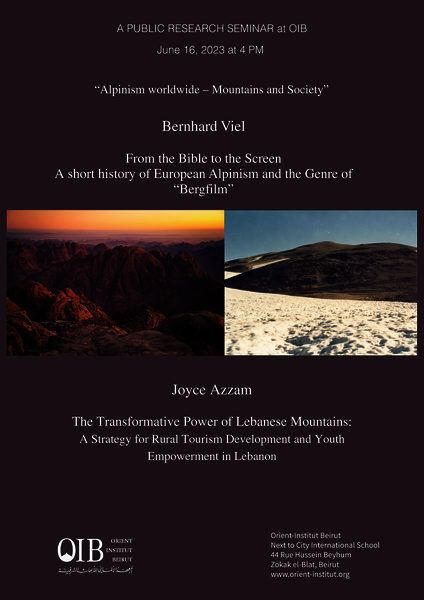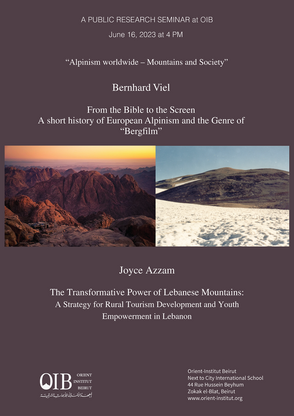 The second day of the seminary “Alpinism worldwide – Mountains and Society” we will start with a talk by Bernhard Viel “From the Bible to the Screen. A short history of European Alpinism and the Genre of “Bergfilm””. At the evening Joyce Azzam will speak about the Lebanese perspective of Alpinism “The Transformative Power of Lebanese Mountains: A Strategy for Rural Tourism Development and Youth Empowerment in Lebanon”.