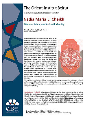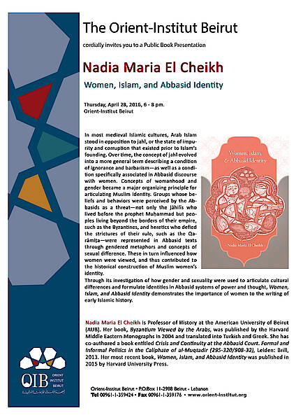 Nadia Maria El Cheikh is Professor of History at the American University of Beirut (AUB). She received her Ph.D. in History and Middle Eastern Studies from Harvard University in 1992 and has served as Director of the Center for Arab and Middle Eastern Studies and as Chair of the Department of History and Archaeology at AUB. Her book, Byzantium Viewed by the Arabs, was published by the Harvard Middle Eastern Monographs in 2004 and translated into Turkish and Greek. She has co-authored a book entitled Crisis and Continuity at the Abbasid Court. Formal and Informal Politics in the Caliphate of al-Muqtadir (295-320/908-932), Leiden: Brill, 2013. Her most recent book, Women, Islam and Abbasid Identity was published in 2015 by Harvard University Press.